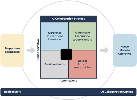Il percorso proposto dall’AI Collaboration Canvas – mappare i processi, valutarne la delegabilità e definire una strategia coerente – consente di costruire una collaborazione efficace tra persone e tecnologie, ridistribuendo il lavoro in modo più intelligente. D’altro canto, l’innovazione non è mai un atto isolato. È una pratica organizzativa, che si rafforza ogni volta che una decisione viene presa in modo più lucido, informato e sostenibile.