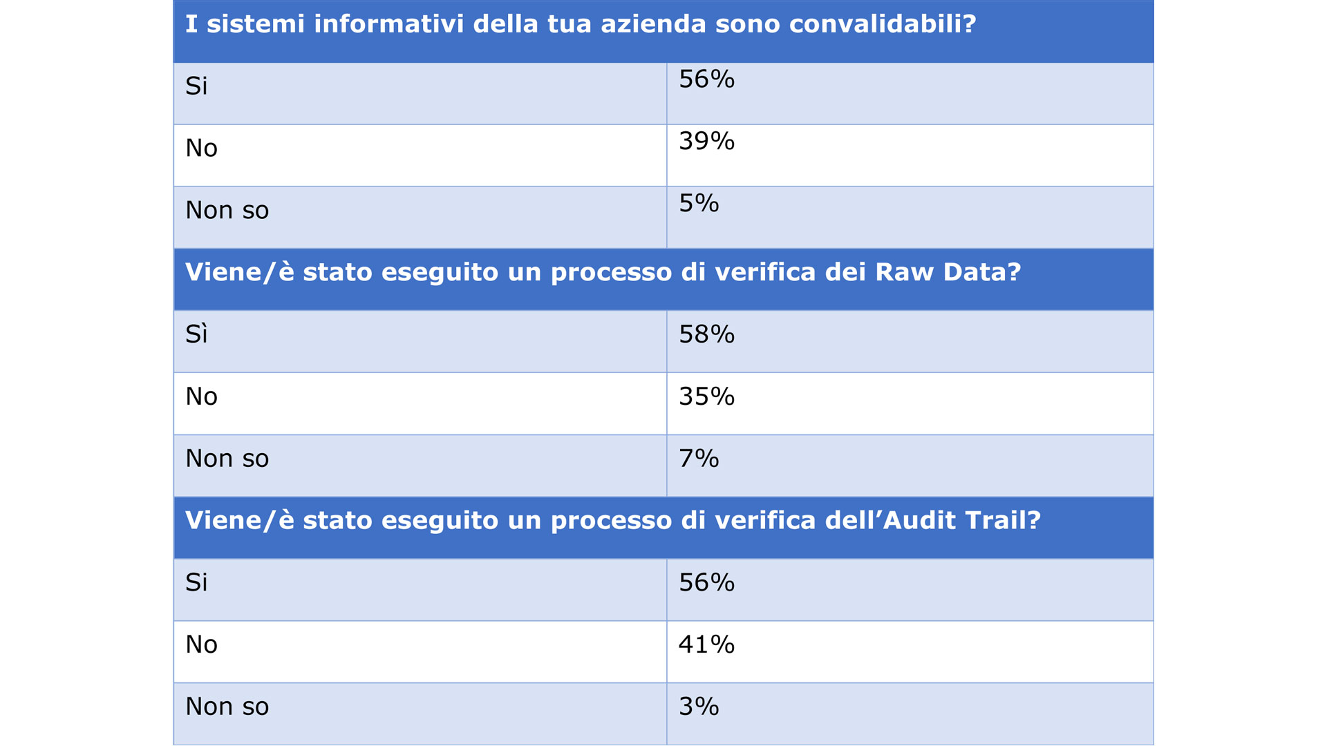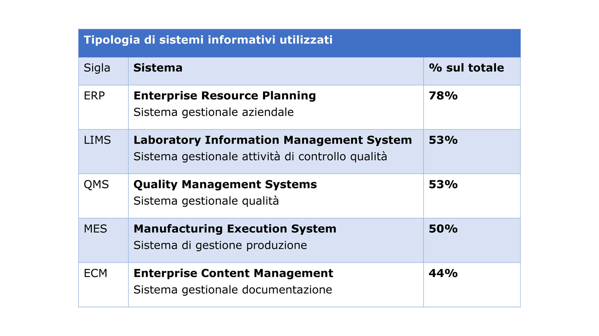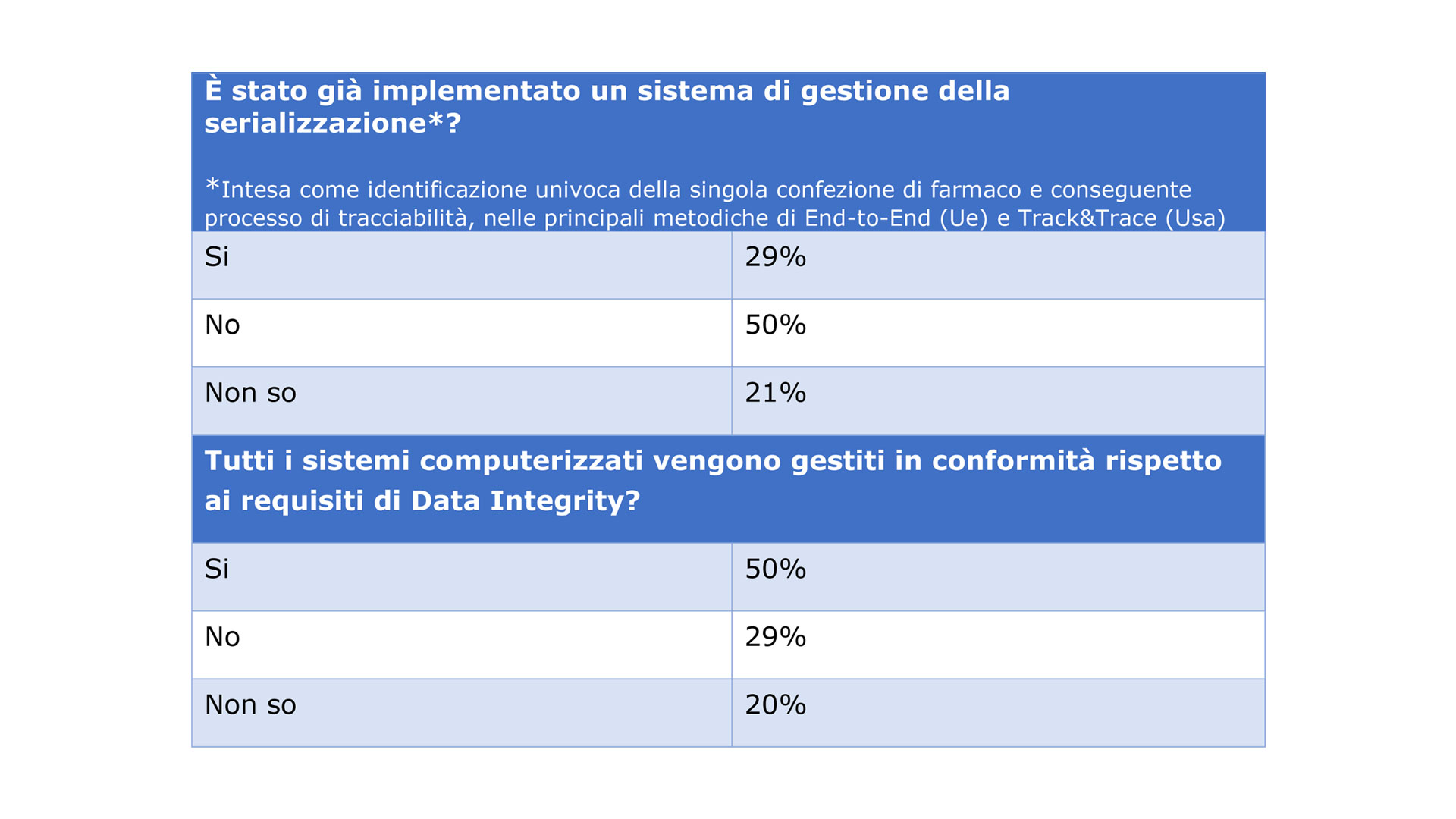 “La nostra survey – è il commento di Bartolini – si basa su un questionario piuttosto complesso e articolato, e invito gli intervistati a coinvolgere altri colleghi con competenze specifiche sull’argomento. Di qui l’alta percentuale di risposte condivise internamente anche con altre funzioni (38%). Ma, come dato non del tutto positivo, va segnalata la presenza marginale della funzione IT (5%): un’incidenza troppo modesta se si considera quale sarà lo scenario previsto in ottica 4.0. Le risposte fornite su temi quali la convalida dei sistemi, l’integrità dei dati, la governance dell’infrastruttura ICT lasciano intravvedere una situazione in cui i margini di miglioramento sono molto ampi. Per questo si rende necessario un intervento molto deciso del top management delle aziende, in modo da poter disporre di strumenti tecnologici adeguati, e adeguatamente gestiti, per poter essere pronti ad accogliere le prossime sfide del mercato, a cominciare appunto dalla tracciabilità e dalla serializzazione”.