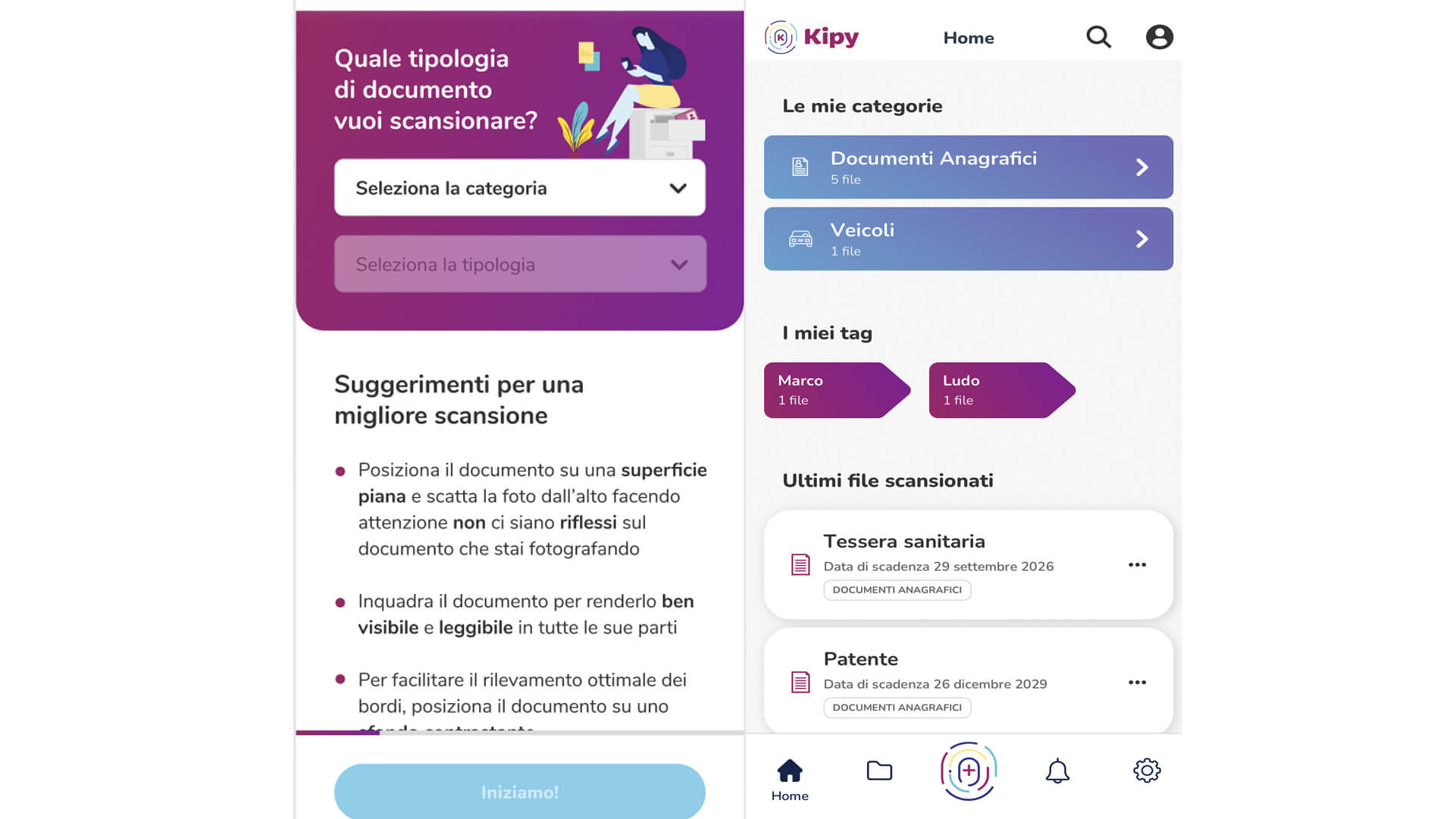 Dopo aver caricato il documento, grazie al sistema di scansione delle “Note” dell’Iphone che identifica bordi e ottimizza immagini, un sistema OCR estrae le informazioni salienti, lo riconosce e lo classifica in una delle categorie 8 predefinite (anagrafici, assicurativi, bancari, per la casa, lavorativi, documenti per i veicoli, scolastici e animali domestici) oppure in “Altro” utilizzando i tag per affinare la ricerca. Con tra le mani un archivio digitale organizzato e fruibile in modo semplice, l’utente può contare su alert push o via mail automatici per rinnovi e scadenze e decidere di condividere ogni singolo documento sia con chi ha Kipy, tramite cloud pubblico, sia con altri, tramite link temporizzato, decidendone la durata.