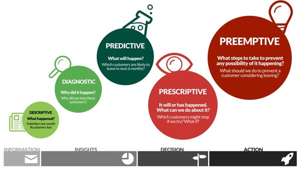 Come si noterà, i prime tre punti fanno già parte dell’implementazione di un sistema di business intelligence. Detto in altre parole, la presenza di un sistema di BI, che presuppone la presenza di un data warehouse con dati puliti e certificati, costituisce un’ottima base di partenza per l’implementazione di modelli predittivi. Le tecniche di predictive analytics rappresentano dunque la naturale evoluzione dei sistemi di business intelligence: da un lato le aziende che hanno già un sistema di BI riescono meglio a comprendere le potenzialità offerte dall’implementazione di tali tecniche; in più vi è la consapevolezza di essere a metà dall’opera, avendo a disposizione una base dati aggiornata, pulita e certificata. La differenza tra la Business Intelligence e l’analisi predittivaObiettivi della BI e delle analisi predittiveLa differenza fondamentale tra la business intelligence e l’analisi predittiva risiede nella domanda a cui esse danno risposta: la business intelligence risponde a “Cosa succederà adesso?” e l’analisi predittiva risponde a “Cosa succederà nel futuro?”. L’obiettivo della business intelligence è identificare dei pattern nei dati storici e attuali per far sì che le aziende possano trarre le proprie conclusioni dall’analisi dei dati. I software di analisi predittiva, che hanno un ruolo complementare in diversi sistemi di business intelligence, costruiscono dei modelli analitici a livello individuale per ogni diverso business e identificano dei comportamenti e delle tendenze che possono essere utilizzate per prevedere la probabilità che si verifichino particolari eventi futuri. La business intelligence ricerca e identifica dei trend a macro-livello per eliminare problemi e inefficienze. La Business Intelligence si posiziona perfettamente nel mezzo tra analisi descrittiva e diagnostica in quanto utilizza i dati per capire cosa sia successo e perché. E rimane lo zoccolo duro su cui basare le analisi predittive in quanto si occupa (e continuerà ad occuparsi) dell’estrazione e normalizzazione del dato che poi può esser “dato in pasto” ai modelli predittivi. Le predictive analytics e la BI sono in competizione tra loro?I due tipi di analisi dati non sono in alcun modo in contrasto tra loro, come in uno scontro tra passato e futuro, ma anzi collaborano e lavorano all’unisono svolgendo ruoli differenti che si intersecano e possono interagire per fornirsi reciprocamente dati e informazioni. Non è assolutamente raro, infatti, che gli strumenti di machine learning estraggano dati dal Data warehouse da elaborare e alla fine dell’elaborazione passino la probabilità calcolata nuovamente al DWH per aggiungere informazioni alle tabelle del data base stesso. A riprova di questo, si riscontra una tendenza nuovo nel mondo della business intelligence. Molti software di più (come SAP Analytics Cloud, Power BI, Tableau ecc) hanno iniziato a implementare funzionalità di AI per permettere di coniugare analisi di BI e di predictive analytics nello stesso strumento. Ovviamente si tratta di primi approcci a questo “nuovo mondo” e non mettono, ancora, a disposizione tutte le funzionalità e gli algoritmi di Machine Learning ma è sicuramente un indizio significativo sulla direzione che si sta intraprendendo e soprattutto sulla necessità di rendere compatibili e collaborative le analisi su dati storici e su previsioni future. Un esempio classicoUn esempio classico di questo interscambio di informazioni potrebbe essere rappresentato da un DWH che raccoglie le informazioni (anagrafiche e transazionali) della base dei clienti tenendo traccia, ad esempio, della durata di vita del cliente, del numero e dell’importo delle transazioni, della situazione creditizia del singolo cliente corredate da tutte le informazioni anagrafiche raccolte dall’organizzazione. Tali dati vengono raccolti e strutturati all’interno di una tabella (per semplificare l’esempio) del DWH. Con tale data set è possibile ipotizzare di costruire un algoritmo di machine learning (ad esempio, un albero decisionale) per indagare sulle principali motivazioni di churn dei clienti, ossia sui motivi che portano più spesso i clienti ad abbandonare l’azienda. Questo algoritmo potrebbe essere implementato su un software differente e specifico di ML (come ad esempio Knime, phyton, R, Amazon SageMaker ecc). Si partirebbe con l’estrazione delle informazioni dal DWH, poi si passerebbe all’elaborazione dell’algoritmo e alla restituzione al DWH della medesima tabellina con l’aggiunta di una colonna, che ad esempio mostri la probabilità % di churn da parte del cliente. |