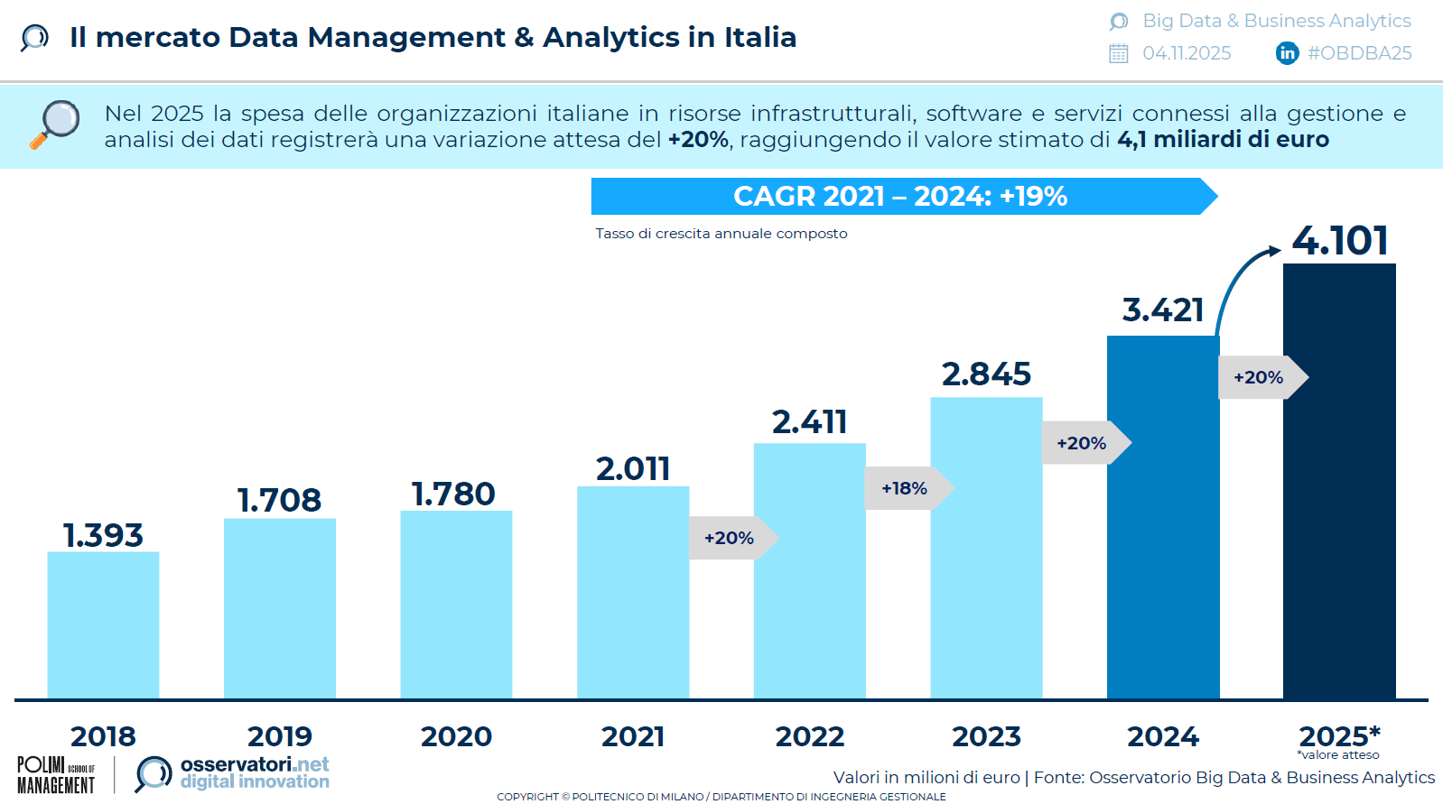 La trasformazione guidata dai dati continua a essere una leva cruciale per la competitività delle imprese italiane. Secondo i risultati della ricerca 2025 dell’Osservatorio Big Data & Business Analytics del Politecnico di Milano, presentati da Carlo Vercellis e Alessandro Piva — rispettivamente Responsabile Scientifico e Responsabile della Ricerca — durante l’appuntamento “Data & Decision Intelligence: pilotare l’AI per usarla davvero!”, la spesa complessiva in soluzioni di Data Management, Business Analytics e Intelligenza Artificiale ha raggiunto i 4,1 miliardi di euro, registrando una crescita del 20% rispetto all’anno precedente .