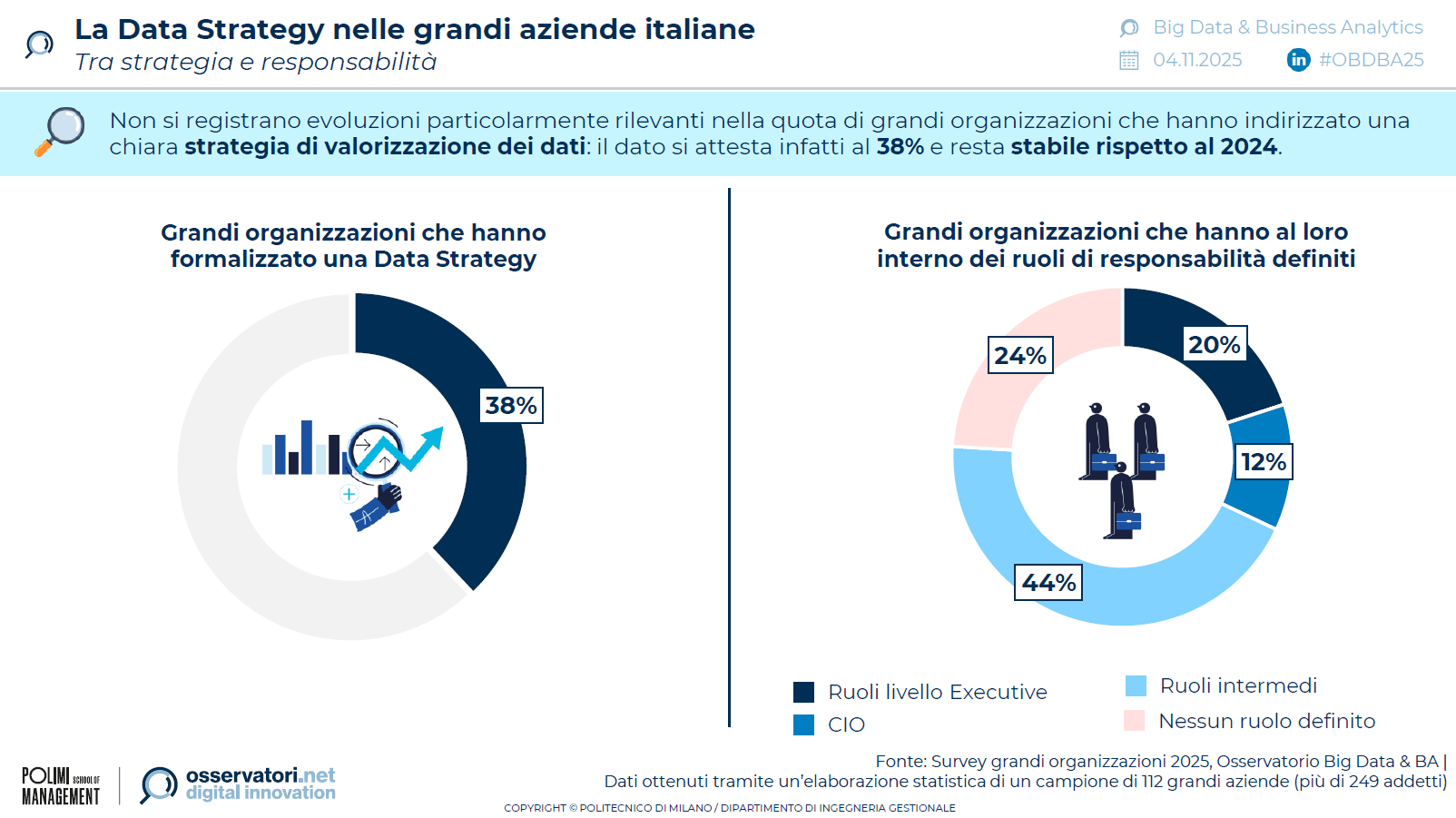 In Italia gli investimenti in soluzioni di Analytics e Data Management superano i 4 miliardi di euro, con una crescita del 20% rispetto all’anno precedente. I dati mostrano un ecosistema in evoluzione, dove la GenAI accelera gli investimenti, ma la vera sfida per le imprese resta la AI-readiness. La ricerca degli Osservatori del Polimi