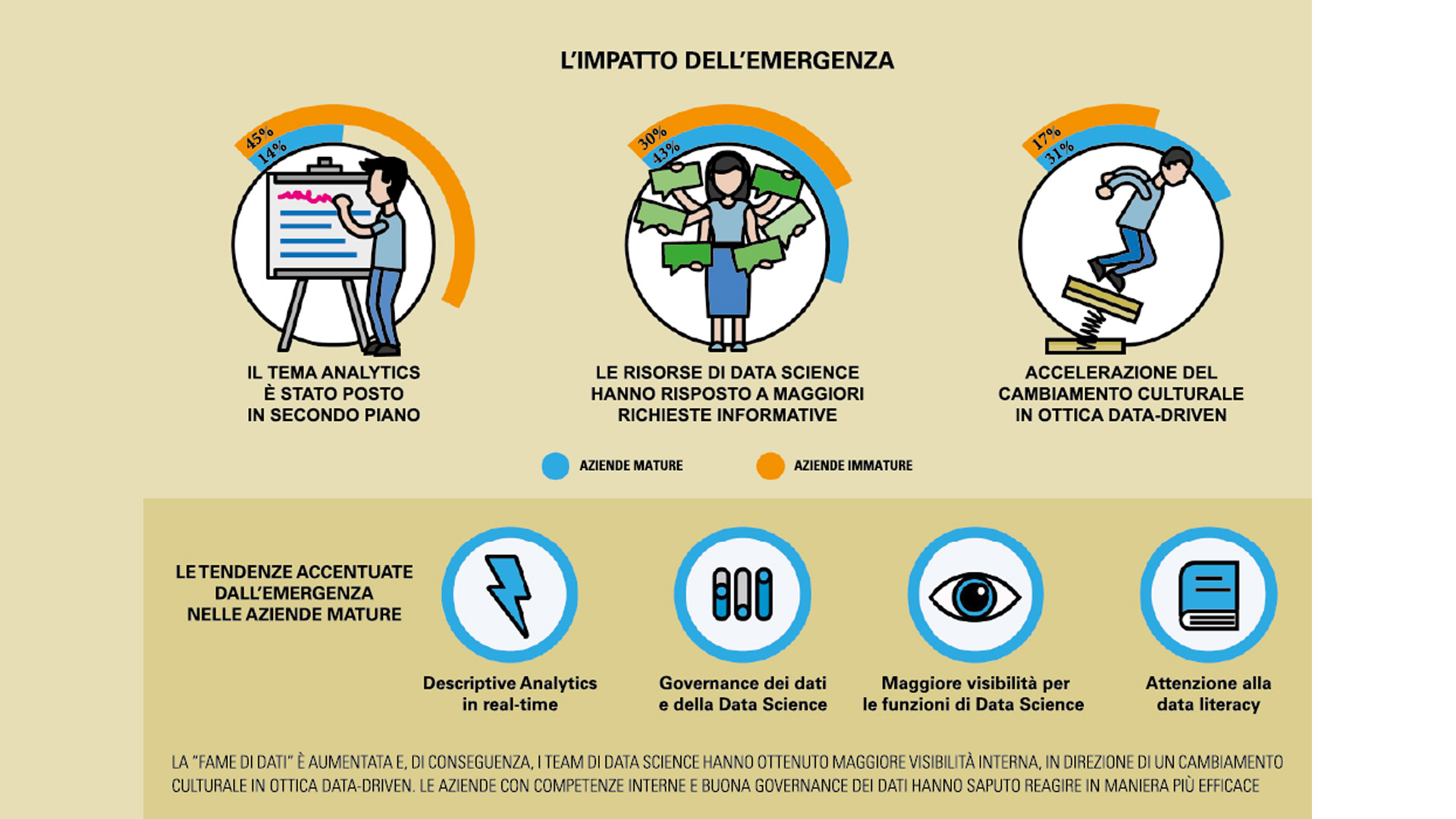 Le aziende mature hanno tra le prime priorità l’inserimento di nuove competenze (58% di risposte), tra le immature questo avviene solo nell’8% dei casi. E la differenza si nota anche nella risposta all’emergenza: solo il 14% delle imprese mature ha messo la valorizzazione dei dati in secondo piano in questi mesi (mentre lo ha fatto il 45% delle immature), anzi il 43% ha intensificato il lavoro di data science e il 31% ha avuto benefici in termini di cambiamento culturale data-driven (queste percentuali si fermano rispettivamente al 30% e al 17% fra le imprese immature).