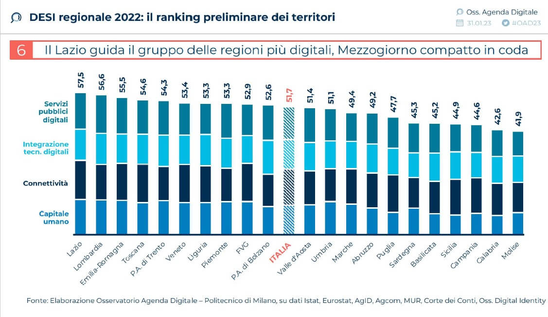 Un’altra dimensione di analisi è il livello di articolazione regionale in cui, anche quest’anno, l’Osservatorio ha calato il DESI.