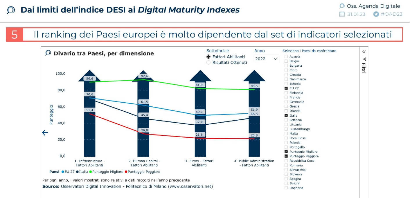 L’Osservatorio Agenda Digitale del Politecnico di Milano ha reso disponibili una serie di strumenti utili per favorire le decisioni e l’operatività nella trasformazione digitale del paese, superando alcuni limiti dell’indicatore europeo DESI (link a 6490). Di seguito ci soffermeremo su: