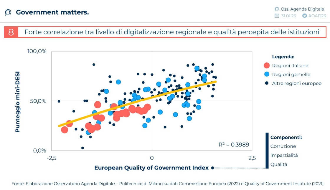Un ruolo centrale, per effettuare un salto significativo nella digitalizzazione, è assegnato alle istituzioni locali come emerge dalla correlazione, rilevata dall’Osservatorio, fra alcuni indicatori di trasformazione digitale e la qualità del governo regionale percepita. Anche in questo caso, le regioni italiane si collocano in posizione inferiore a quella delle gemelle digitali, con le regioni del sud che tuttavia performano relativamente meglio.