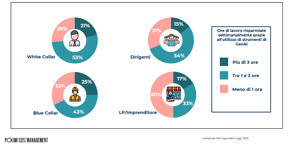 Secondo una ricerca degli Osservatori del Polimi, i risultati in termini di efficienza (ore risparmiate settimanalmente) con l’utilizzo della GenAI già oggi sono tangibili: il 15% dei dirigenti oggetto dell’indagine ha beneficiato di più di 3 ore risparmiate alla settimana, per arrivare al 25% nel caso dei blue collar.