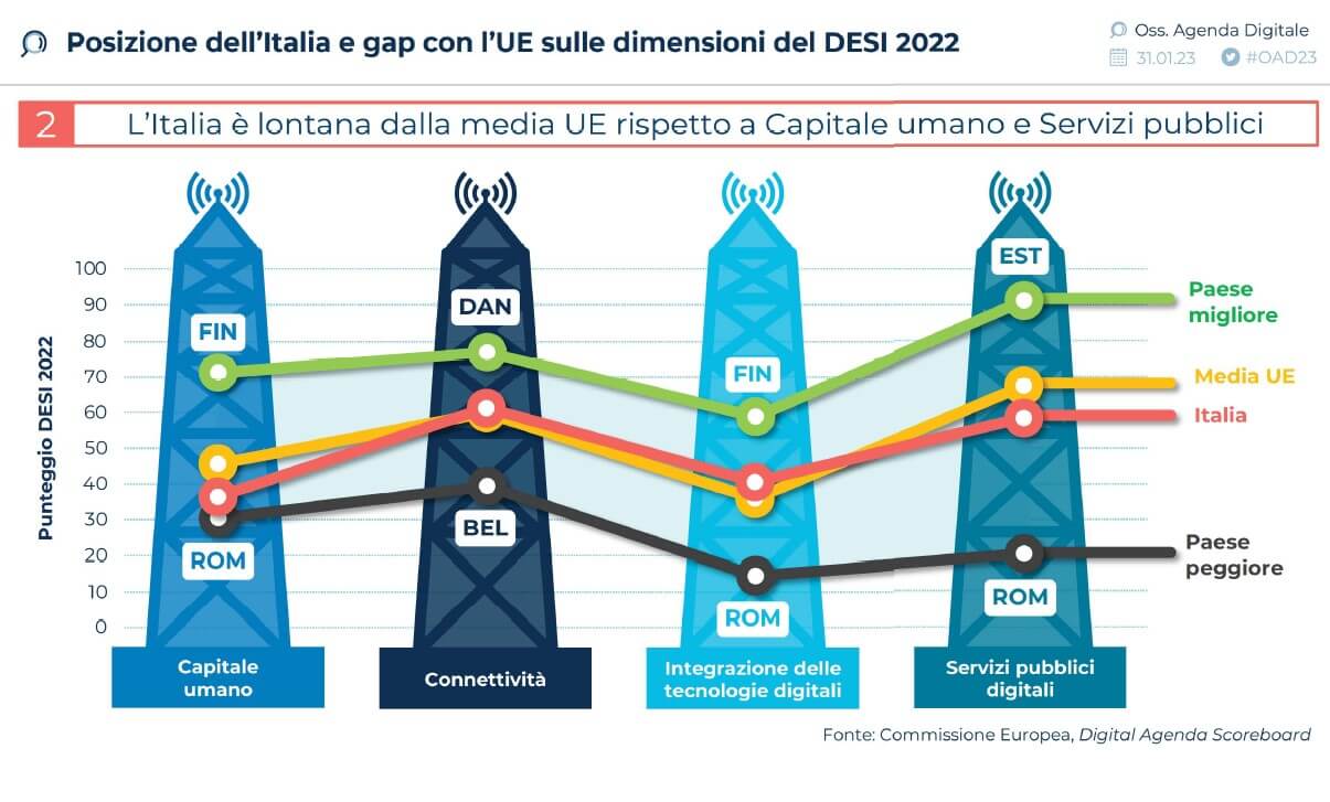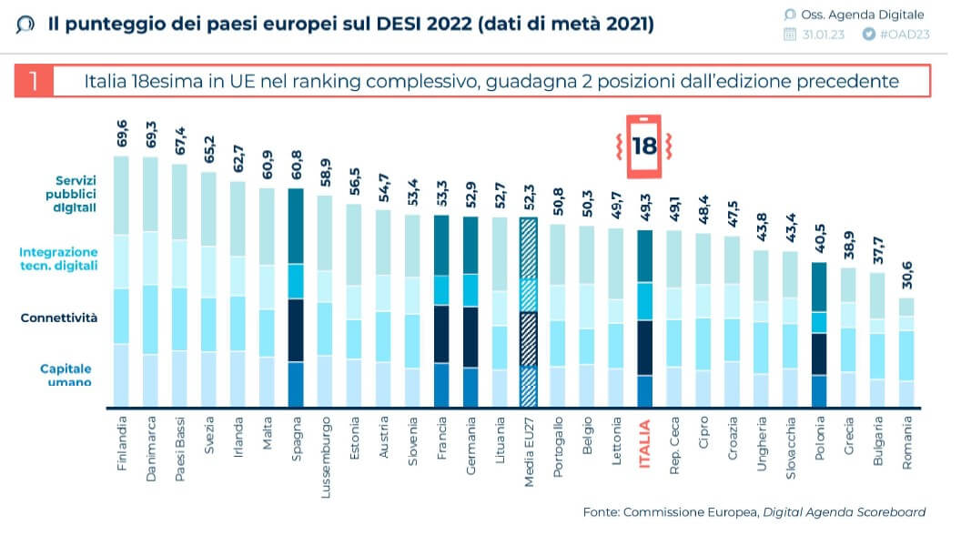 È questa la posizione dell’Italia nell’indice europeo DESI 2022, con un punteggio 49,3, sotto la media dei 27 e molto indietro rispetto a paesi simili come Spagna (in settima posizione con 60,8), Francia e Germania, nonostante l’avanzamento di 2 punti rispetto 2021.