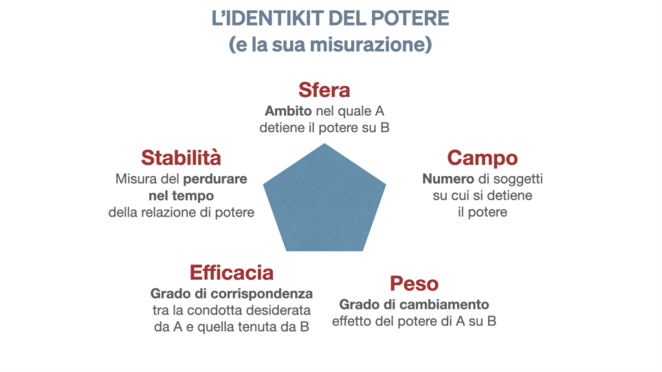 Vi propongo, quindi per il primo un set di misure definite — sfera, campo, peso, efficacia, stabilità — e per la seconda una tassonomia di azioni di potere — sanzione e remunerazione, persuasione, condizionamento, manipolazione, reazioni previste, imitazione.