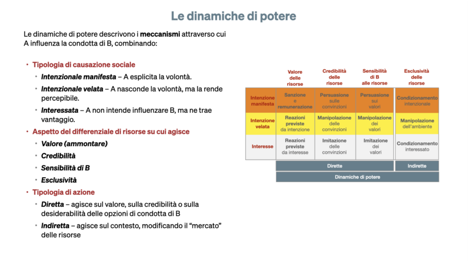 È incrociando queste dimensioni che si possono collocare le principali dinamiche: sanzione e remunerazione, persuasione (sulle convinzioni o sui valori), condizionamento (intenzionale o interessato), manipolazione (delle convinzioni, dei valori o dell’ambiente), reazioni previste (da intenzione velata o da interesse) e imitazione (delle convinzioni o dei valori).