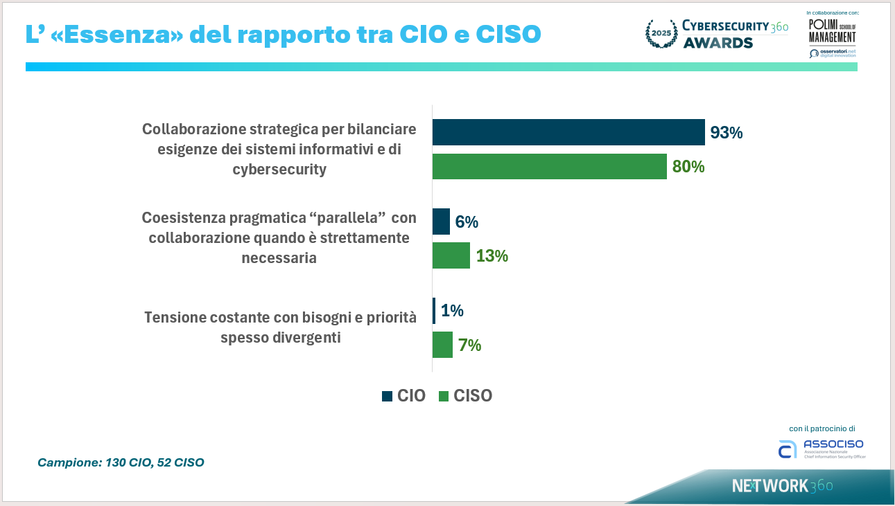 Dai risultati della ricerca presentata da Raffaello Balocco, professore al Polimi e co-founder di Digital360 e Nextwork360, ai Digital360 Awards e CIOsumm.IT, emerge un quadro in cui collaborazione e fiducia sono fattori essenziali, ma non sempre scontati. La survey, basata su un’indagine condotta durante l’estate su un campione di 52 CISO e 130 CIO di grandi aziende italiane, delinea trend qualitativi che aiutano a comprendere le dinamiche tra due figure centrali della trasformazione digitale.