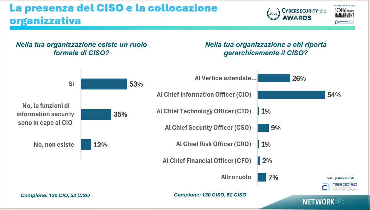 Quando presente, il CISO riporta al CIO nel 54% dei casi, mentre nel 26% risponde direttamente al vertice aziendale, come l’amministratore delegato o il direttore generale. Solo piccole percentuali riferiscono al Chief Security Officer (9%), al Chief Financial Officer (2%) o ad altre funzioni come il Chief Risk Officer.