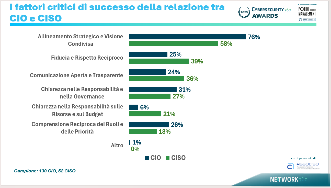 Secondo i CISO intervistati, i fattori determinanti sono fiducia, rispetto reciproco, comunicazione trasparente e chiarezza nella governance. I CIO aggiungono l’importanza della comprensione dei ruoli e delle priorità. Tuttavia, Balocco ha osservato come, nei dati dei CISO, emerga un segnale di “maggiore sofferenza”, con meno percezione di fiducia e comunicazione aperta.