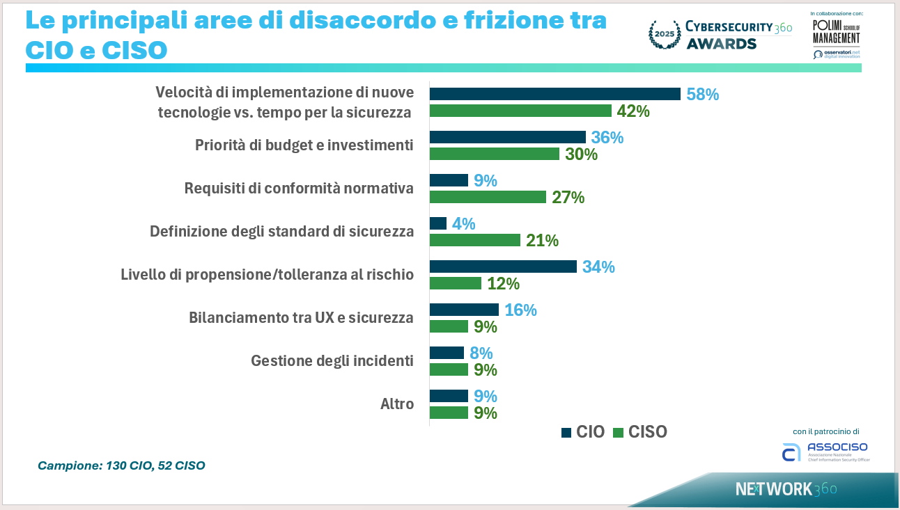 Le principali aree di disaccordo individuate dai CIO riguardano tre aspetti: la velocità di implementazione delle nuove tecnologie rispetto ai tempi richiesti per garantire la sicurezza, le priorità di investimento e di budget, e la differente tolleranza al rischio.