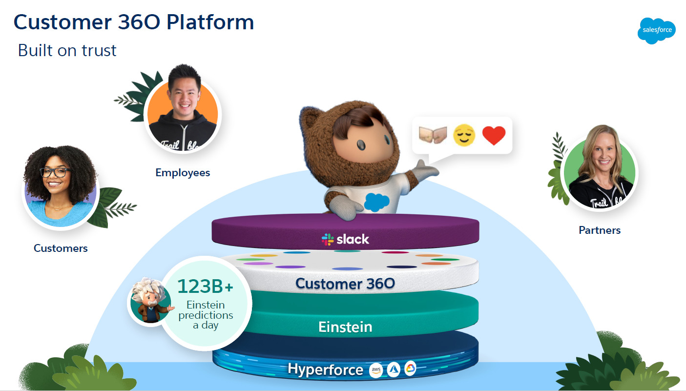 La declinazione pratica prevede una struttura a “livelli”, in cui cloud pubblico (Hyperforce), intelligenza artificiale (Einstein) e strumenti di comunicazione (il neo acquisto Slack) convergono nella creazione di un ecosistema completo che consente ad aziende e organizzazioni di rispondere alle richieste di un pubblico sempre più orientato alla digitalizzazione.
