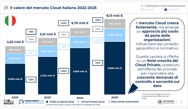 È quanto emerge dall’ultima edizione dell’Osservatorio Cloud Transformation della School of Management del Politecnico di Milano, che fotografa un mercato in espansione – 8,13 miliardi di euro nel 2025, +20% sul 2024 – ma anche attraversato da nuove priorità: sovranità digitale, sicurezza e integrazione dell’intelligenza artificiale nei processi di business.