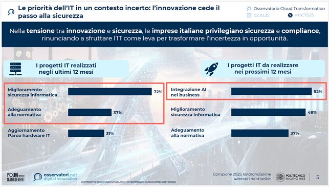 Sul fronte delle priorità IT, la sicurezza guadagna terreno rispetto all’innovazione: il 72% delle imprese ha avviato progetti di cybersecurity, mentre il 37% lavora sull’adeguamento normativo alle nuove direttive europee (NIS2, DORA, AI Act).