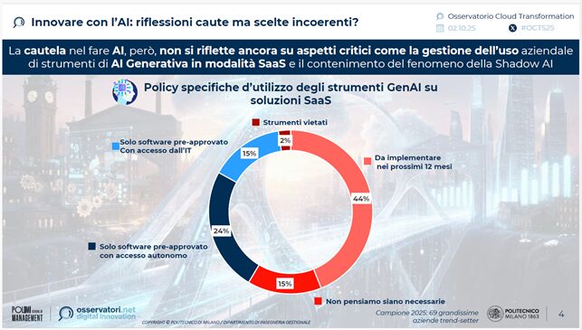 «L’intelligenza artificiale e il Cloud sono inseparabili. La nuvola è il motore che rende possibile l’AI, ma per coglierne i benefici le imprese devono imparare a coniugare innovazione e governance dei dati» spiega Mariano Corso, Responsabile Scientifico dell’Osservatorio. «Permane un vuoto di governance preoccupante: il 59% delle organizzazioni non ha ancora introdotto policy per contrastare la perdita o l’uso improprio di informazioni sensibili da parte dei dipendenti che utilizzano strumenti di AI Generativa».