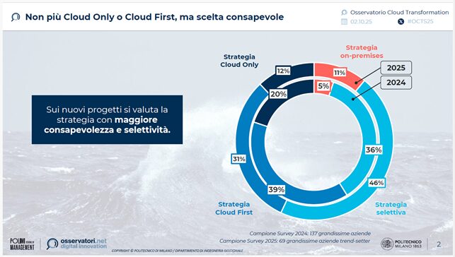 Il quadro che emerge è quello di una maggiore selettività: il 46% delle grandi organizzazioni adotta strategie ibride e mirate (+10 punti rispetto al 2024), mentre l’approccio Cloud First cala dal 39% al 32%. Anche la Pubblica Amministrazione rafforza il proprio percorso verso il Cloud, con i progetti previsti dalla Strategia Cloud Italia e dal Polo Strategico Nazionale.