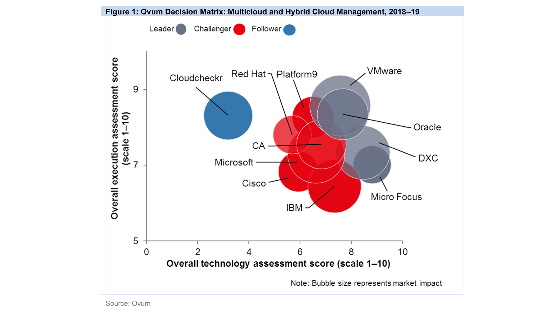 Sia che si tratti di scegliere un ambiente multicloud, sia che si opti per un cloud ibrido, il mercato dell’offerta si sta evolvendo rapidamente con player tradizionali e nuovi player che si stanno conquistando un proprio spazio d’azione. I vendor tradizionali, infatti, sono messi alla prova dalla competitività di nuovi player più disruptive, che stanno proponendo alcune soluzioni davvero innovative, progettate per affrontare le sfide di operare in un ambiente di servizi IT eterogeneo e multimodale. La ricerca di Ovum mostra, a questo proposito una mappatura dei fornitori: a capitanare la classifica ci sono DXC, Micro Focus, Oracle e VMware, seguiti da altri brand, ripartiti in due gruppi, sfidanti e follower.