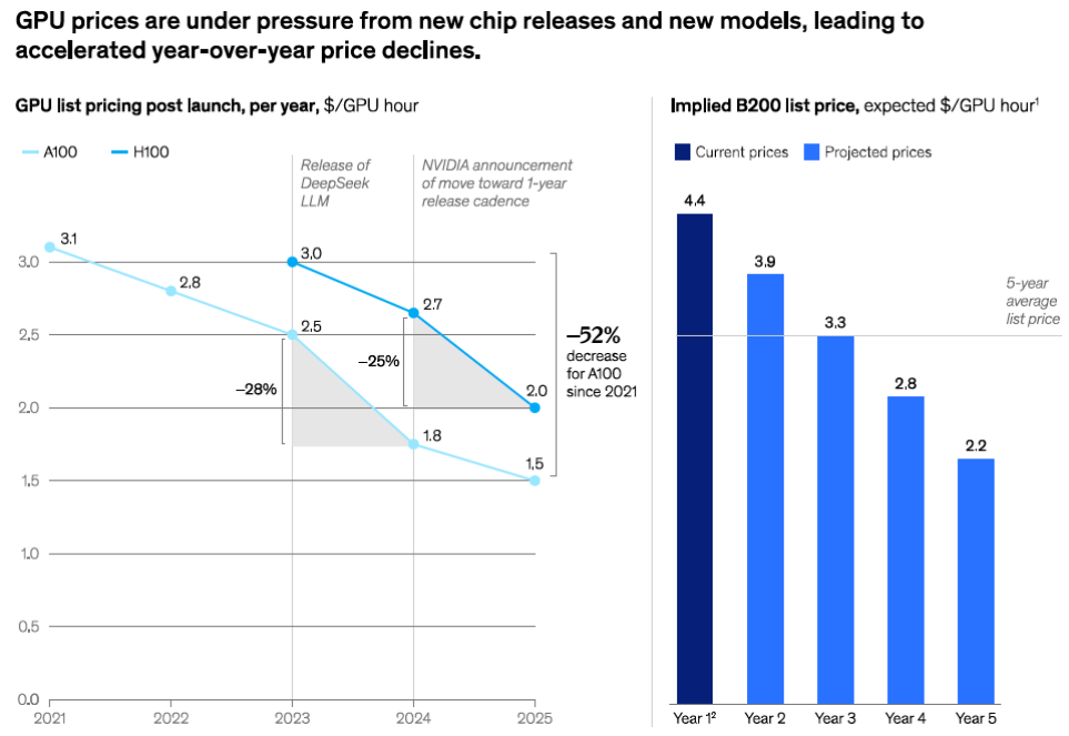 La sostenibilità economica dei neocloud resta il punto più critico. Il ciclo di aggiornamento rapidissimo dei chip porta a una continua erosione del prezzo della GPU-hour, come illustrato nel grafico in basso: entro 4–5 anni il prezzo medio orario di una GPU può dimezzarsi.