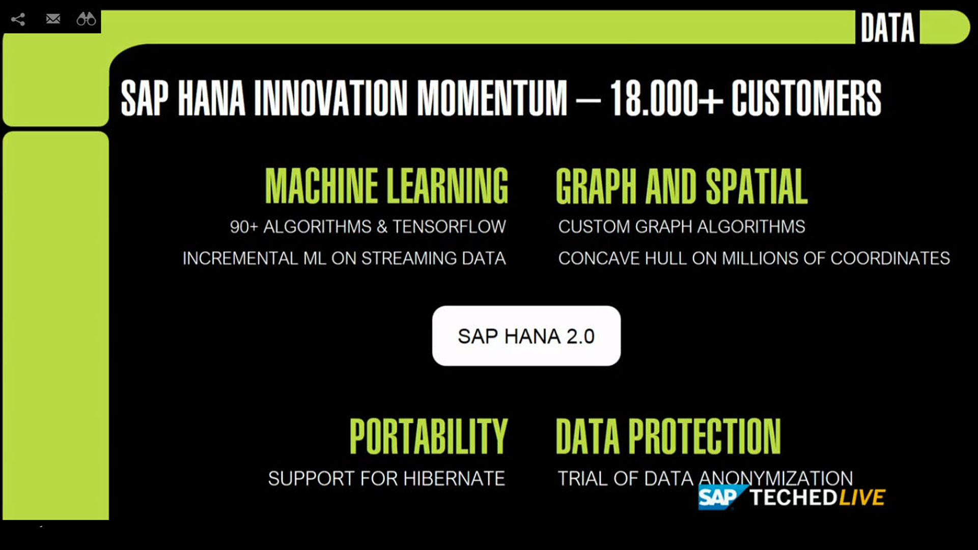 Bjorn-Kirk ha ricordato come, per supportare l’articolato mondo dei dati cui l’azienda può attingere oggi (strutturati e non strutturati nei più svariati formati e dimensioni), SAP abbia “re-immaginato il mondo dell’analisi in tempo reale con la tecnologia dell’in-memory computing che ha dato una nuova energia a questi dati e oggi, con SAP Hana 2.0, questa energia è stata ulteriormente potenziata con l’integrazione di tecniche di machine learning: oltre 90 algoritmi speciali e TensorFlow [modo per fare il training e usare le reti neurali per compiti come riconoscimento di immagini, di testo e traduzione linguistica ndr] consentono alla piattaforma di incrementare le proprie capacità di analisi”.