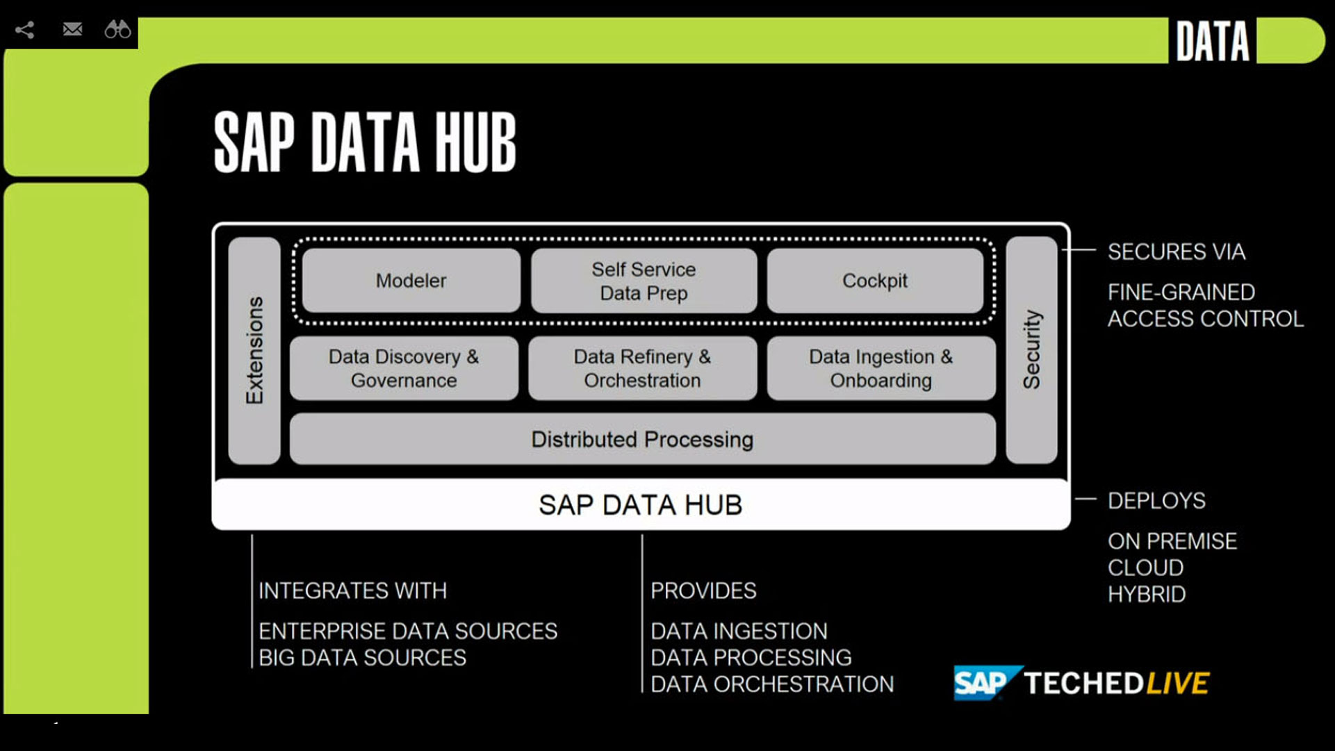 Obiettivo di SAP Data Hub è proprio quello di gestire, organizzare, orchestrare questo insieme di dati al fine di condividerli e distribuirli agilmente in tutta l’organizzazione aziendale: “Sviluppata con la logica dei container, SAP Data Hub è un’architettura che consente di operare sui vostri dati in qualsiasi ambiente: on premise, in cloud e in ambienti ibridi. E oggi annunciamo che metteremo questa architettura nella vostre mani – ha dichiarato il CTO rivolgendosi alla platea di sviluppatori presenti in sala – rilasciando entro fine mese la versione per sviluppatori di SAP Data Hub”.