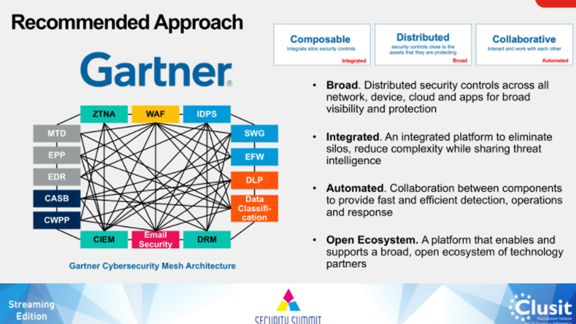 Il primo istinto, spiegano gli esperti, deve essere quello di fermarsi per avere la consapevolezza e il controllo dei propri strumenti. L’approccio che ne segue deve basarsi sul consolidare le scelte delle soluzioni adottate e ridurre la complessità, a partire dal numero degli interlocutori. La riduzione della complessità può legarsi anche a un approccio di tipo mesh già individuato da Gartner, come un insieme coeso e resistente creato attorno all’architettura dell’azienda visto il superamento del perimetro aziendale.