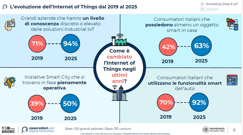 La crescita riguarda sia il mondo consumer sia quello industriale. Aumenta la presenza di dispositivi smart nelle abitazioni, si consolidano le iniziative di smart city e cresce la familiarità delle imprese con le soluzioni IoT. Allo stesso tempo, il peso dei servizi sul mercato complessivo segnala un’evoluzione verso modelli più maturi.