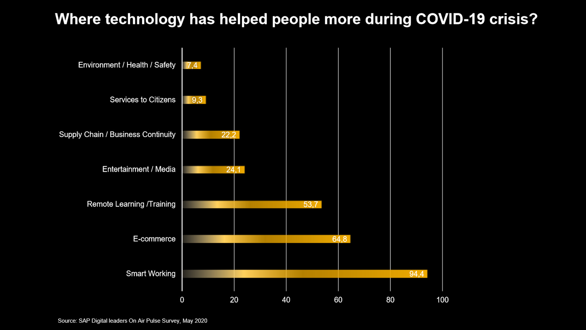 Il futuro delle imprese dettate dai CEO sarà l’evoluzione verso un’organizzazione intelligente e lo sviluppo di servizi ed esperienze digitali affidabili per clienti, partner e non ultimi i dipendenti. In questi mesi, i CEO hanno dovuto promuovere nuovi modelli di lavoro. Lavoro agile, salute e sicurezza dei dipendenti sono divenuti nuovi temi da ampliare. Un esempio, ricorda Raptopoulos, è la Provincia Autonoma di Bolzano che in sole tre settimane è riuscita a cambiare la destinazione di un progetto IT, basato su tecnologia SAP, trasformandolo per sostenere e aiutare professionisti e piccole imprese locali nella richiesta dei contributi economici pubblici per fronteggiare la crisi.