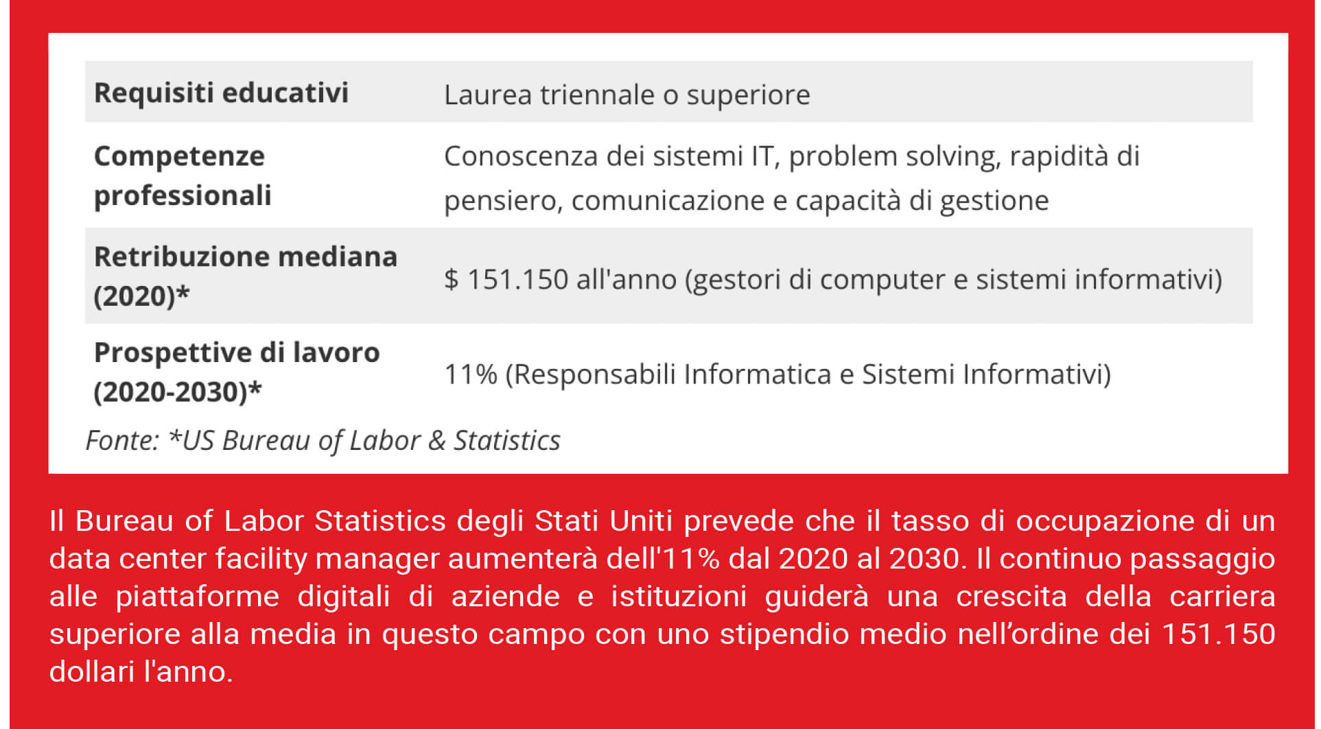Figura di presidio e di governo, il data center facility manager ha in carico la supervisione dell’intero edificio del data center, dall’esterno dell’edificio fino alle stanze che ospitano l’infrastruttura, lavorando con tutti i responsabili di area. Per farlo utilizza alcuni sistemi di monitoraggio (utilizzati anche dagli amministratori di data center) e dashboard basate sui ruoli per tenere traccia dei controlli ambientali o dell’accesso alla sicurezza degli amministratori. Che si tratti di un data center dedicato o di una struttura colocation, i data center facility manager controllano la posizione fisica, collaborando e supportando i team IT per migliorare i tempi di attività dell’infrastruttura.
