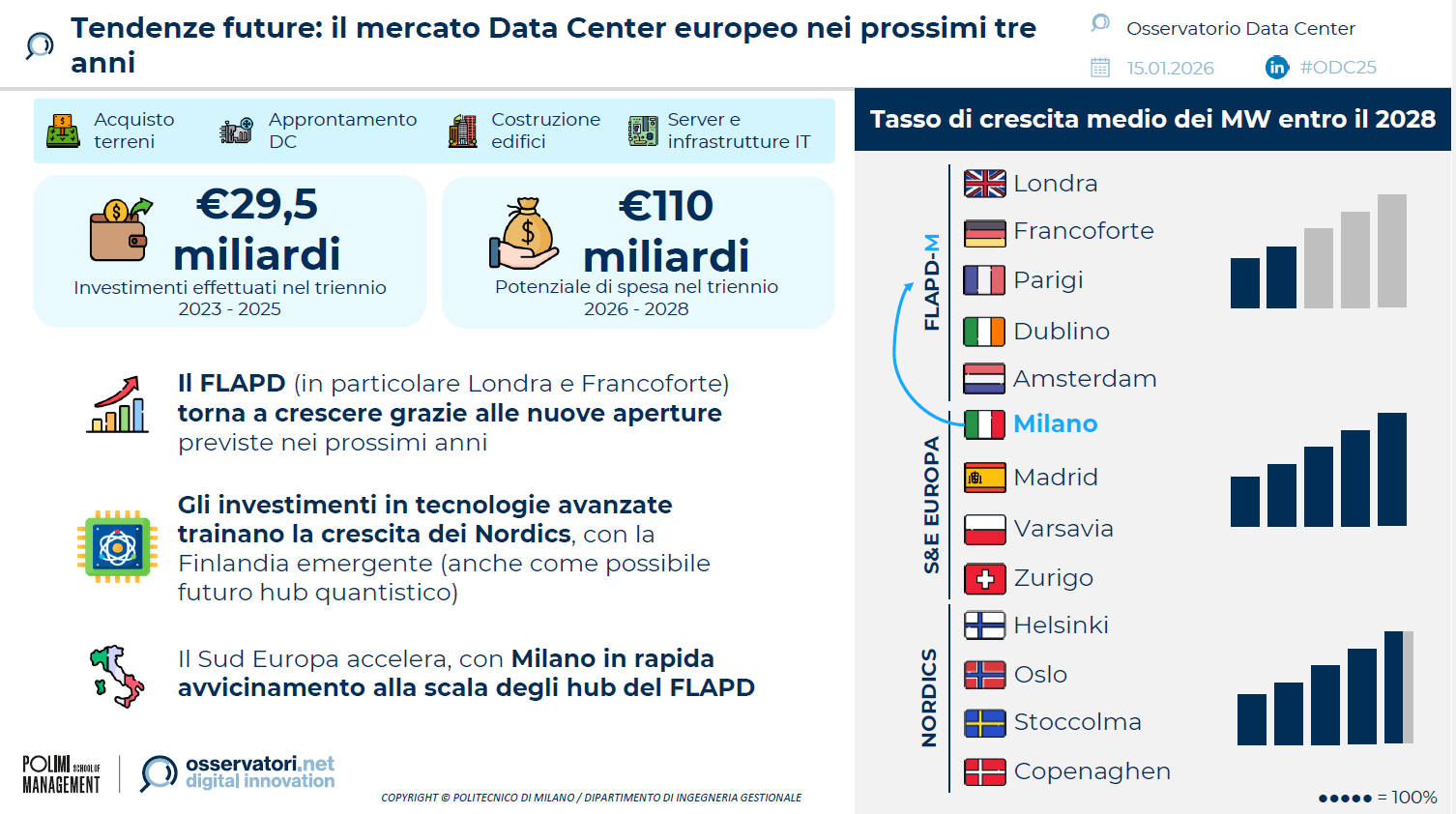 Milano continua a giocare un ruolo di primo piano, confermandosi come il principale polo nazionale. L’area milanese concentra attualmente il 68% della potenza installata e, secondo le stime sui principali poli europei, potrebbe catalizzare oltre il 20% degli investimenti totali dell’area nei prossimi anni. L’obiettivo simbolico per il mercato milanese è il raggiungimento della soglia di 1 GW di potenza intorno al 2028, un traguardo che lo posizionerebbe sullo stesso ordine di grandezza dei mercati tradizionali FLAPD (Francoforte, Londra, Amsterdam, Parigi, Dublino).
