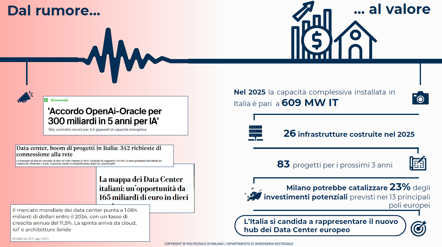 Il mercato delle infrastrutture digitali nel nostro Paese sta attraversando una fase di trasformazione profonda, segnata da una dicotomia tra l’entusiasmo generato dai grandi annunci e la realtà della messa a terra dei progetti. In occasione del convegno “Dal rumore al valore: l’Italia come nuovo Data Center Hub europeo” promosso dall’Osservatorio Data Center del Politecnico di Milano, sono stati presentati i risultati della ricerca che analizzano come l’Italia stia cercando di consolidarsi come hub europeo.