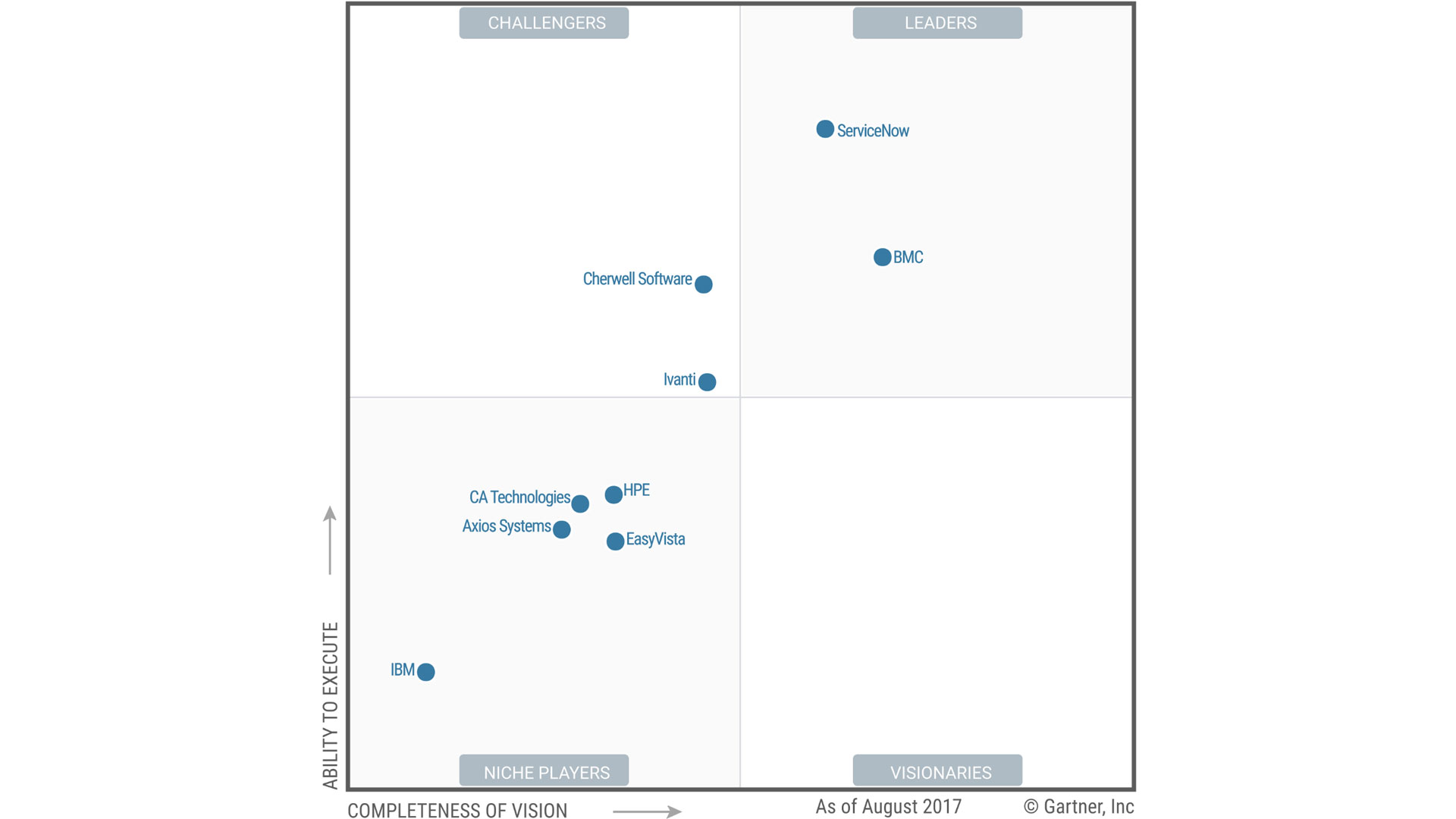 Vuoto il quadrante dei visionari, proponiamo quindi un più rapido accenno ai due vendor nel quadrante dei Challengers, Cherwell Software e Ivanti, che (pur non avendo ad oggi una strategia di prodotto, di marketing, di vendita e in generale una vision ai livelli dei vendor leader) hanno aumentato la loro quota di mercato e migliorato i loro software ITSM divenendo più fortemente competitivi.