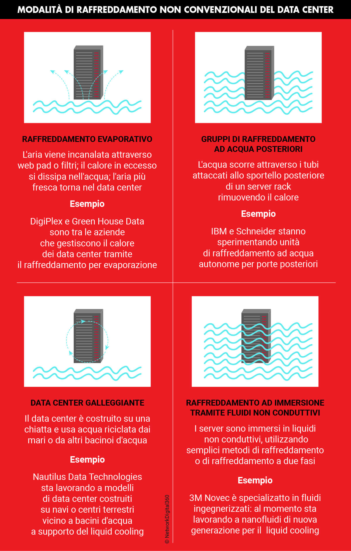 Una tecnologia più recente e che sta facendo grandi progressi è il raffreddamento a immersione. Con il liquid cooling a immersione tutti i componenti interni del server sono immersi in un fluido dielettrico non conduttivo. Il mezzo di raffreddamento in origine era l’olio minerale, sebbene i data center oggi possano utilizzare anche altri fluidi come, ad esempio, il 3M Novec (noto anche come acqua secca).