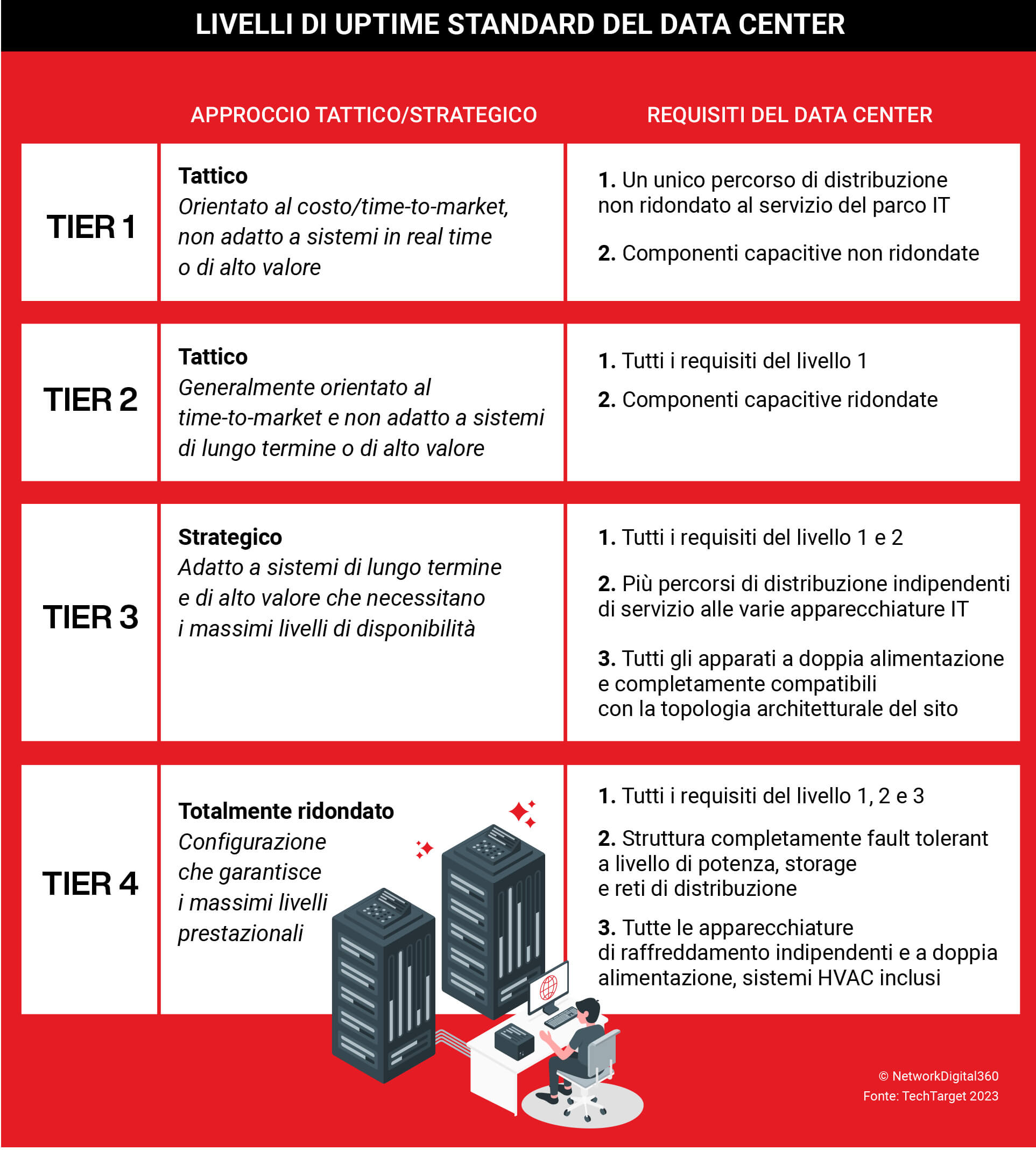 Il sistema N è un modo utile per misurare la ridondanza, ma in pratica, ottenere il massimo tempo di attività è qualcosa di più della semplice aggiunta di componenti. Uptime Institute ha creato un sistema per spiegare l’infrastruttura necessaria alla piena operatività del data center, ripartita su quattro livelli principali.