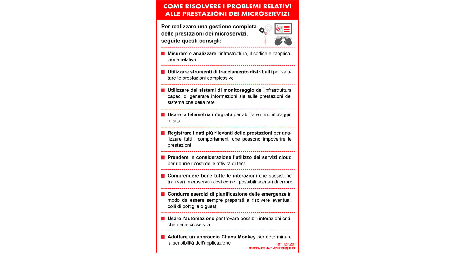 Le applicazioni basate su microservizi, infatti, consumano più risorse e comportano un carico maggiore per i server rispetto alle applicazioni monolitiche. Il che, tradotto, significa che saranno necessari dei server aggiuntivi. Queste richieste di risorse rendono ancora più fondamentale l’efficienza del sistema di codifica così come la comprensione delle dipendenze specifiche tra due o più microservizi. In questo caso il consiglio è di tenersi pronti ad aumentare rapidamente la capacità del server in caso di richieste ad alte prestazioni. Ricordandosi poi di ridimensionare le risorse quando finisce il picco per evitare di sprecare la potenza dei server.