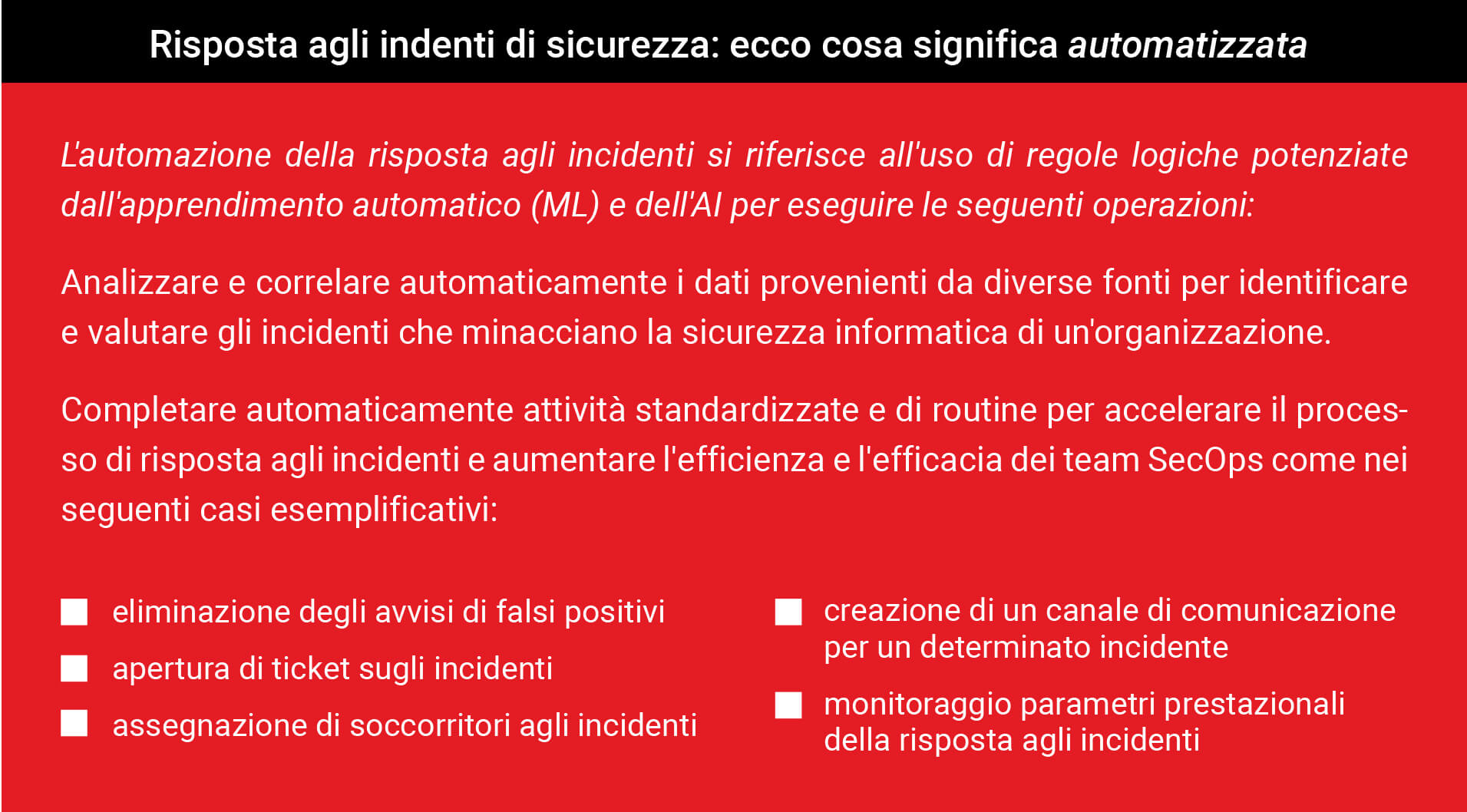 L’automazione aiuta, ma deve essere fatta in modo responsabile: è importante che gli analisti che utilizzano l’automazione comprendano cosa stanno automatizzando e le conseguenze in quanto non si tratta di una procedura del tipo imposta e dimentica. Le funzionalità di automazione devono essere verificate periodicamente per assicurarsi che continuino a svolgere il lavoro per cui sono state progettate».