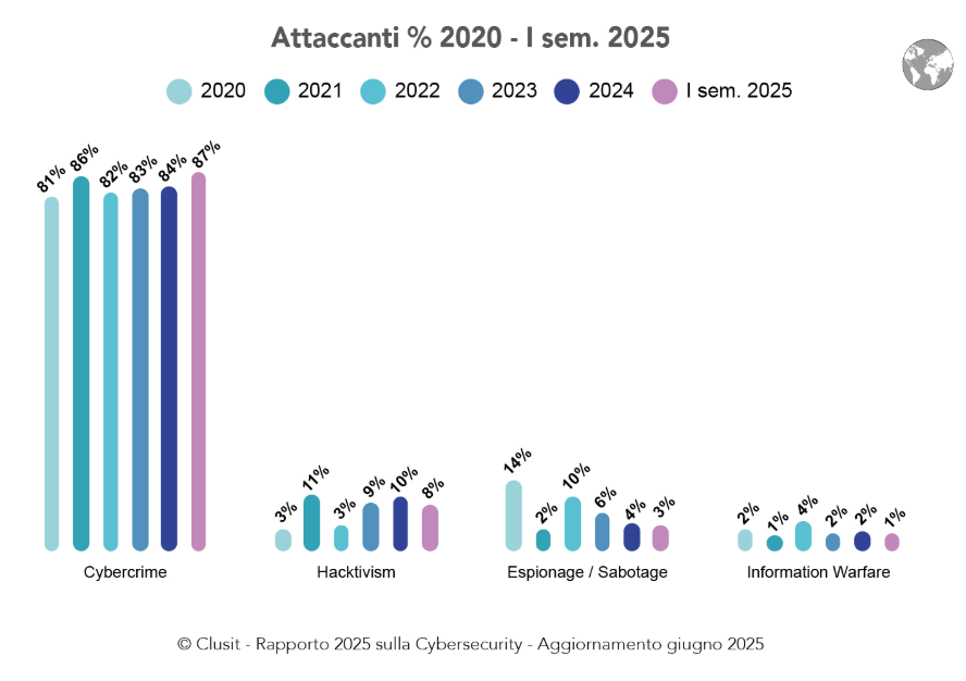 Il dato forse più significativo riguarda la motivazione degli attacchi. Il cyber crime rappresenta l’87% del totale. Una quota che conferma e rafforza la centralità del profitto economico come principale motore delle azioni malevole.