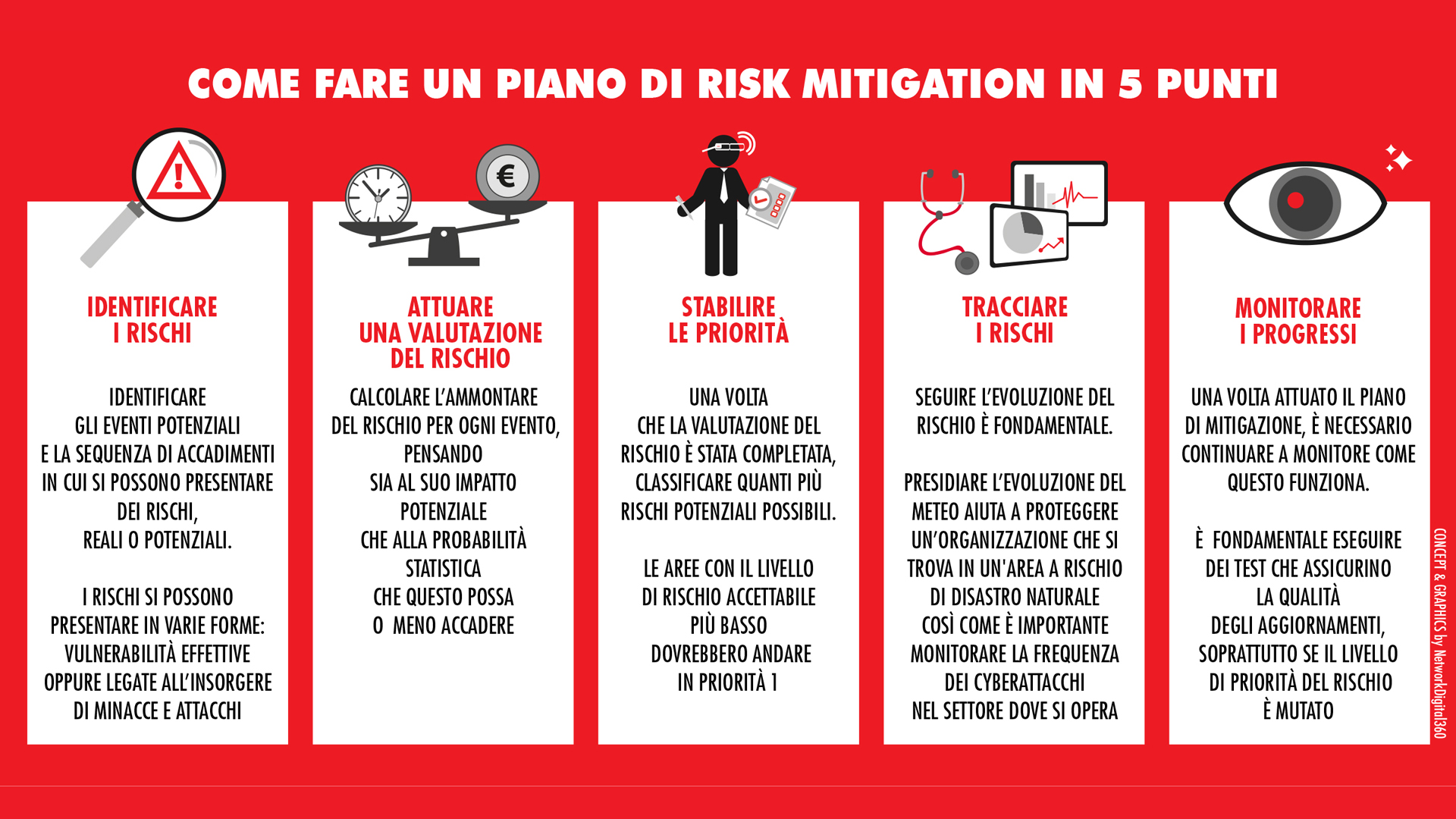 Le organizzazioni possono trarre vantaggio spostando il focus sulla riduzione complessiva di tutti i margini di rischio possibili. La visibilità della sicurezza generale dell’organizzazione diventa così parte integrante di una nuova cultura manageriale. La riduzione del rischio aziendale e lo sviluppo di un linguaggio comune di gestione del rischio richiedono a un’organizzazione la definizione di un piano che include 5 fasi:
