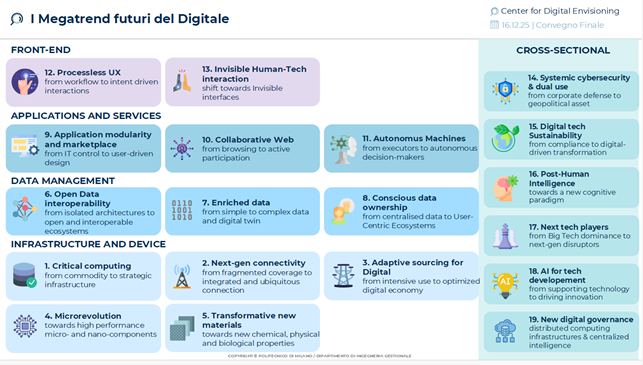 I megatrend individuati dal Center for Digital Envisioning sono organizzati in cinque macrocategorie, che coprono l’intero ecosistema digitale: infrastrutture e device, data management, applicazioni e servizi, front-end e dinamiche trasversali . Tra questi, sei (Critical computing, Enriched Data, Web collaborativo, interazione uomo-tecnologia invisibile, Post-Human Intelligence e NextTech Players) emergono per profondità di impatto e velocità di sviluppo.