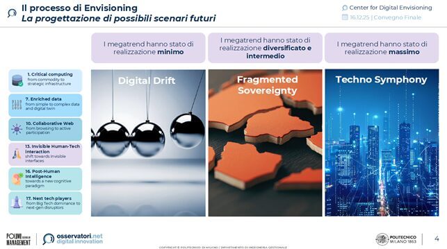 Il futuro del digitale? Non è una traiettoria unica, è il risultato di scelte tecnologiche, industriali e di governance che si compiono oggi. È da questa premessa che prende forma il lavoro del Center for Digital Envisioning del Politecnico di Milano, che ha identificato 19 megatrend destinati a influenzare l’evoluzione del digitale nel prossimo decennio, aprendo a scenari profondamente diversi entro il 2035.