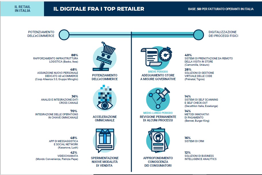 Nel medesimo campione di top retailer presenti nel nostro paese, inoltre, si è registrata un’accelerazione a monte sul versante della data strategy, cioè sull’analisi e la gestione congiunta dei dati raccolti sui diversi canali e aggregati in chiave omnicanale. A valle, si è cercato di attuare un’integrazione di esperienza online e offline offrendo assistenza ai clienti nella scelta e nell’acquisto dei prodotti tramite app di messaggistica e social network (Kasanova con Whatsapp, Lush con Instagram). Altri, come Mondo Convenienza e Patrizia Pepe, si sono avvalsi della videochiamata per dare consulenze personalizzate e abilitare la vendita. C’è chi, infine, soprattutto nel fashion (Motivi), ha sperimentato soluzioni di vendita da remoto più sofisticate, ad esempio mediante piattaforme di live stream shopping.