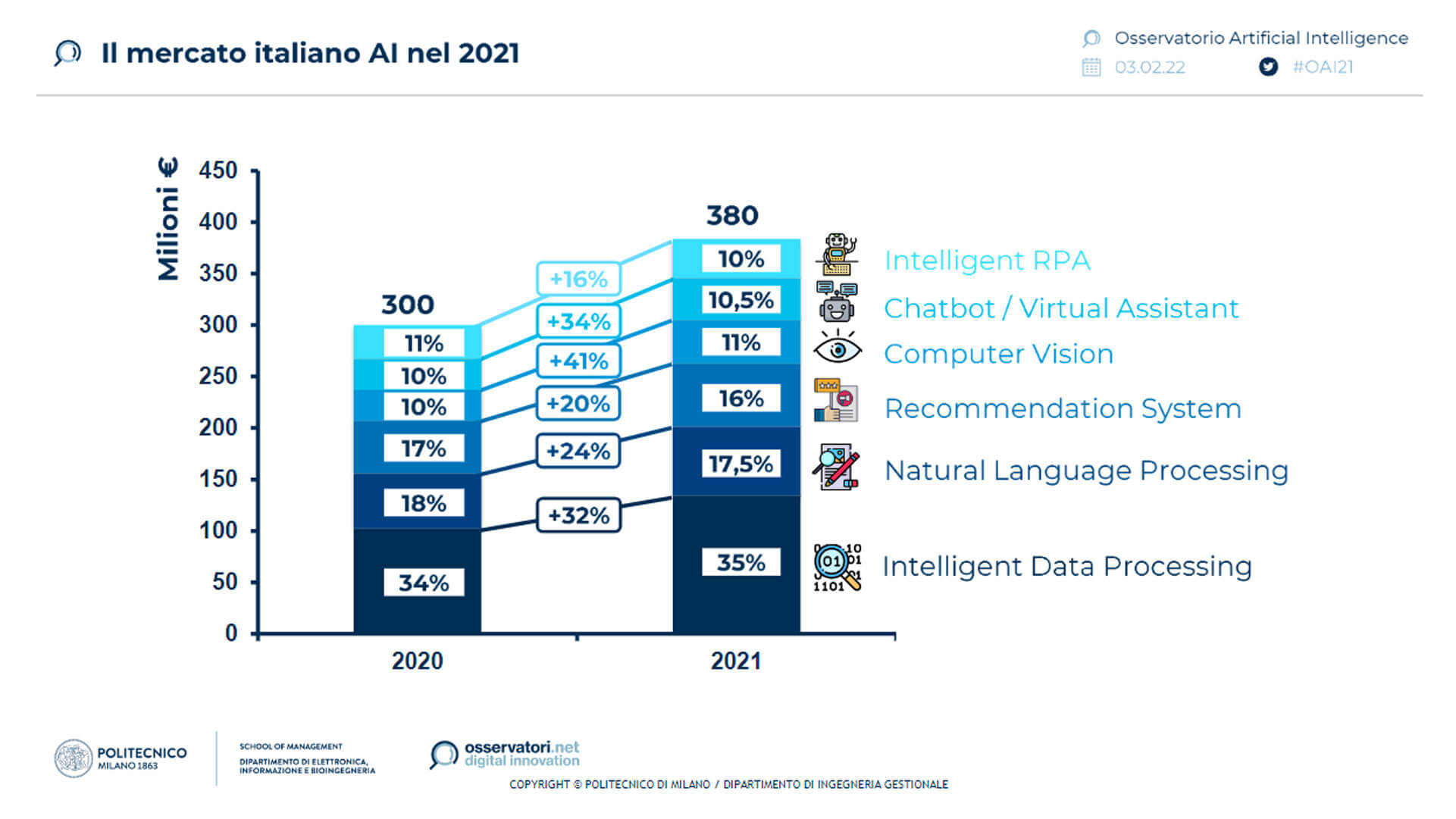 Del totale del giro d’affari dell’intelligenza artificiale (dato globale che è raddoppiato nel giro di due anni) in Italia un terzo (35%) riguarda progetti di algoritmi per analizzare ed estrarre informazioni dai dati (Intelligent Data Processing), ambito che segna anche una delle crescite maggiori, con un +32% rispetto al 2020.