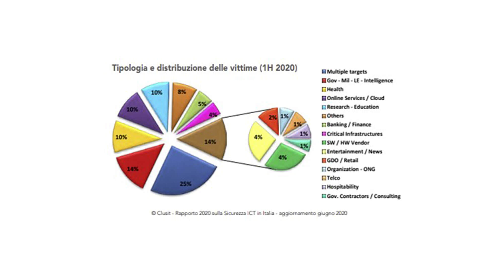 Nei primi sei mesi del 2020 gli esperti Clusit hanno registrato in prevalenza attacchi verso la categoria “Multiple Targets” che, come nel caso specifico degli attacchi a tema Covid-19, risulta la categoria più colpita, in crescita del 26% rispetto allo stesso periodo dello scorso anno.